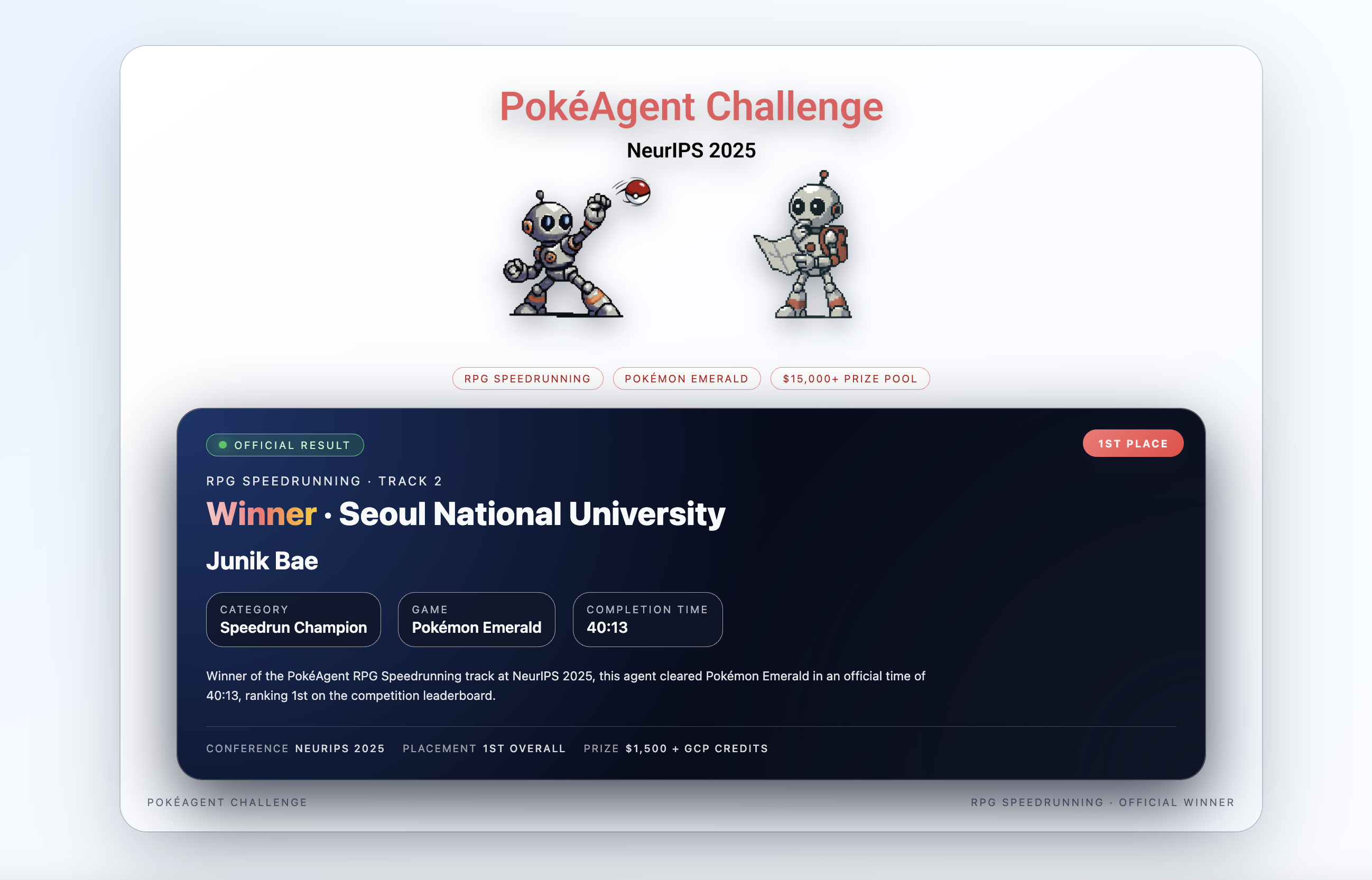 세계적인 인공지능 학회 NeurIPS 2025에서 열린 포켓몬 게임 기반 AI 대회인 PokéAgent 챌린지에서, 본교 컴퓨터공학부 4학년 배준익 학생이 스피드런(speedrun) 트랙 우승을 차지했다. 이번 챌린지는 포켓몬 에메랄드 환경을 기반으로 강화학습(RL)과 대형 언어 모델(LLM)을 결합한 새로운 형태의 에이전트를 평가하기 위해 설계되었다. 스폰서로는 구글 DeepMind가 참여했으며, Princeton, CMU, UT Austin 등 주요 연구 기관의 연구진이 공동으로 대회를 기획했다. 총 상금 규모는 1만 5천 달러를 상회하며, 우승팀에게는 NeurIPS 워크숍 발표 초청과 대회 보고서 공동 저자 참여 기회 등이 제공된다.