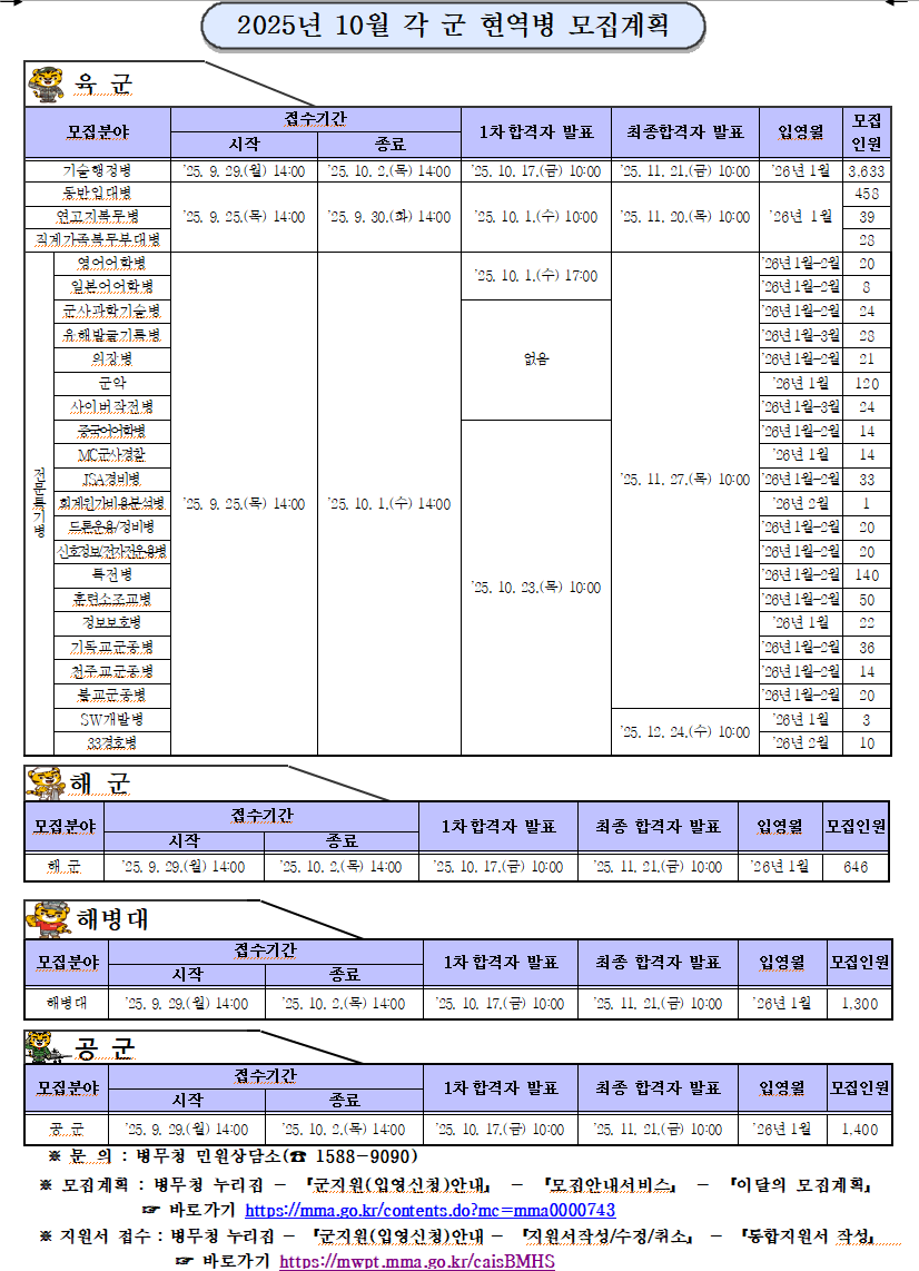 2025년 10월 지원하여 2026년 1월 입영예정인 각 군 현역병 모집일정을 송부하니 학생들의 병역의무 이행에 참고 바랍니다.