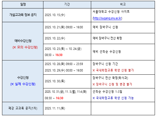 수강신청 | 2025. 10. 28.(화) ∼ 11. 4.(화) | 토·일요일 제외 선착순 수강신청 마감시간 16:30 변경 |