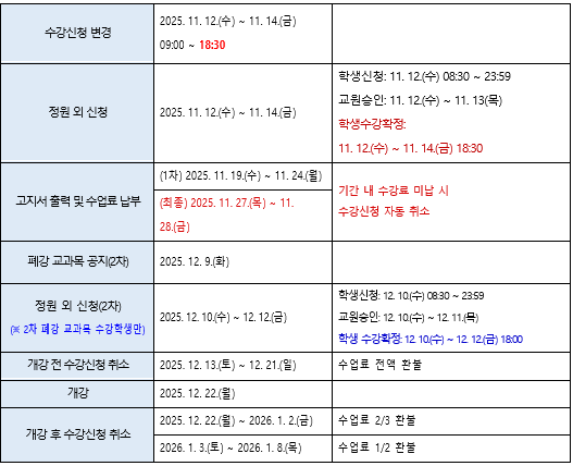 수강신청 변경 | 2025. 11. 12.(수) ∼ 11. 14.(금) | 마감시간 18:30 변경 |