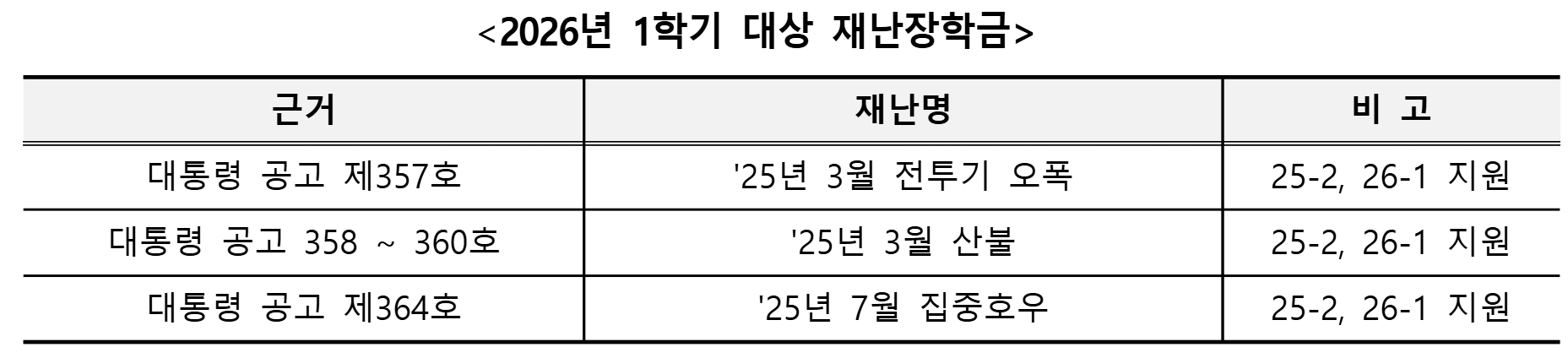 ※ 국가장학금 신청 및 서류확인(서류제출은 대상자에 한함), 가구원 동의가 반드시 완료되어야 2026학년도 1학기 국가장학금 수혜가 가능합니다.