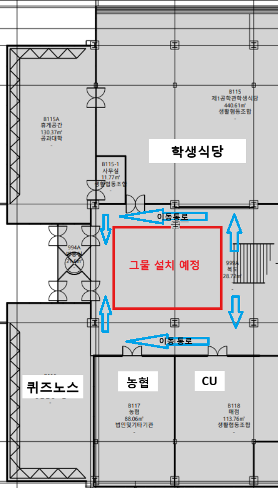 301동 지하 1층 복도 공간에서 2025.12.10(수) 11:00~16:00 시간에 "임베디드시스템과 응용" 과목의 프로젝트로 드론 비행 활동이 예정되어 있습니다.