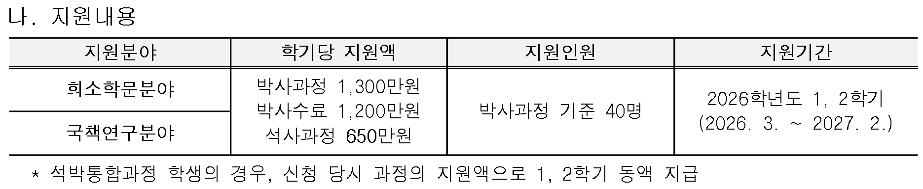- (신규) 2026학년도 1학기 기준 수학 중인 석사 재학생, 박사 재학생(수료생 포함) 중 타 장학금의 지원을 받지 않는 자로서 희소학문분야·국책연구분야의 연구를 하고 있는 학생