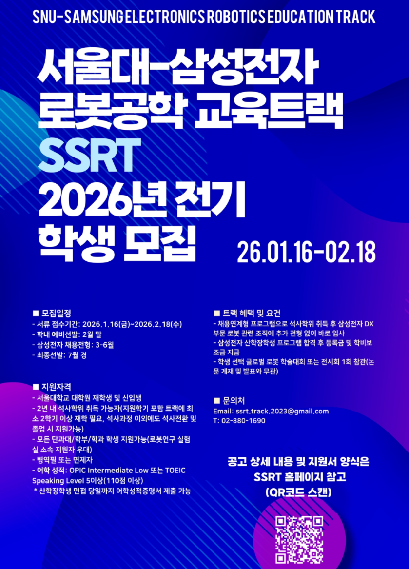 서울대-삼성전자 로봇공학 교육트랙(SSRT) 2026년 전기 대학원 석사과정 트랙학생 모집