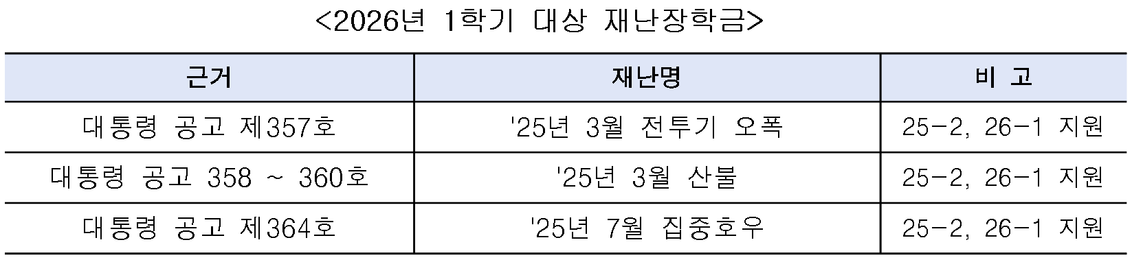 ** 국가장학금 미신청자는 아래 재난장학금 지원이 불가하므로, 특별재난지역 내 피해가구 대학생은 반드시 국가장학금을 신청하시기 바랍니다.