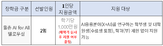 · 율촌 AI for All 펠로우십 : 다양한 학문분야(X)에서 인공지능(AI)을 활용하여 창의적인 연구(AI+X)를 수행하며 AI 응용연구 분야에서 성장가능성이 우수한 학생을 장기 지원하는 장학금
