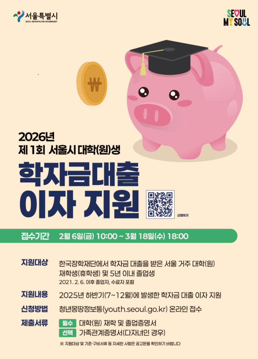 서울시에서 2026년 제1차 대학(원)생 학자금 대출이자 지원 사업을 아래와 같이 시행하고 있으니, 해당 학생들은 지원 바랍니다.