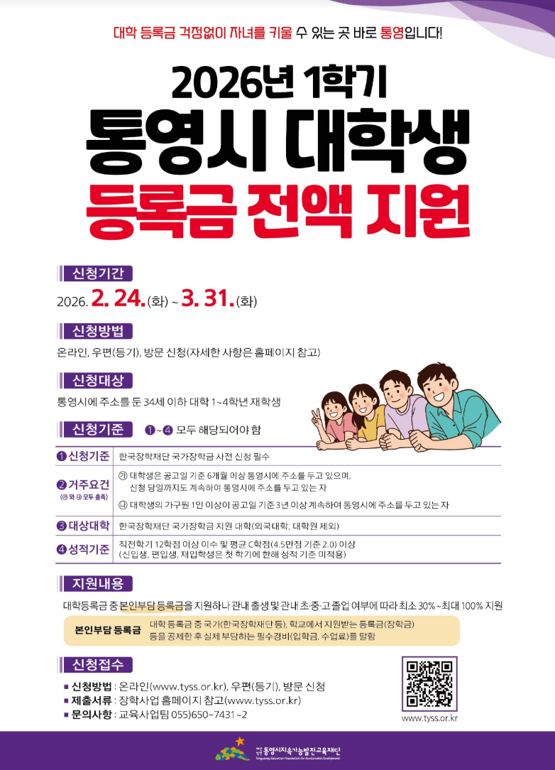 2026년 1학기 통영시 대학생 등록금 전액 지원사업 안내