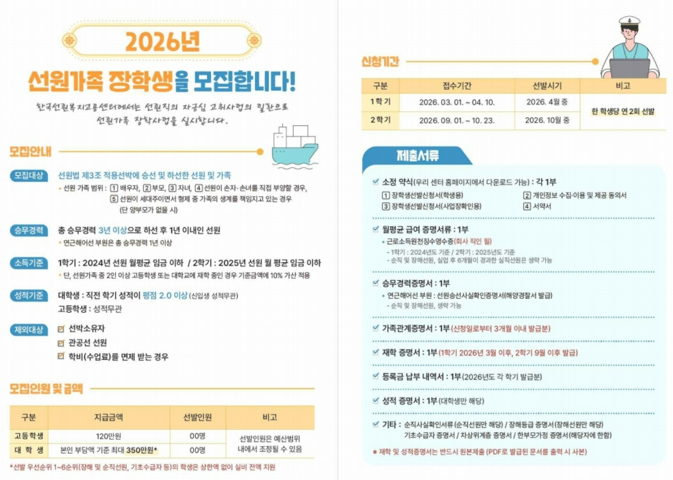 2026년 1학기 한국선원복지고용센터 선원가족 장학생 선발 안내