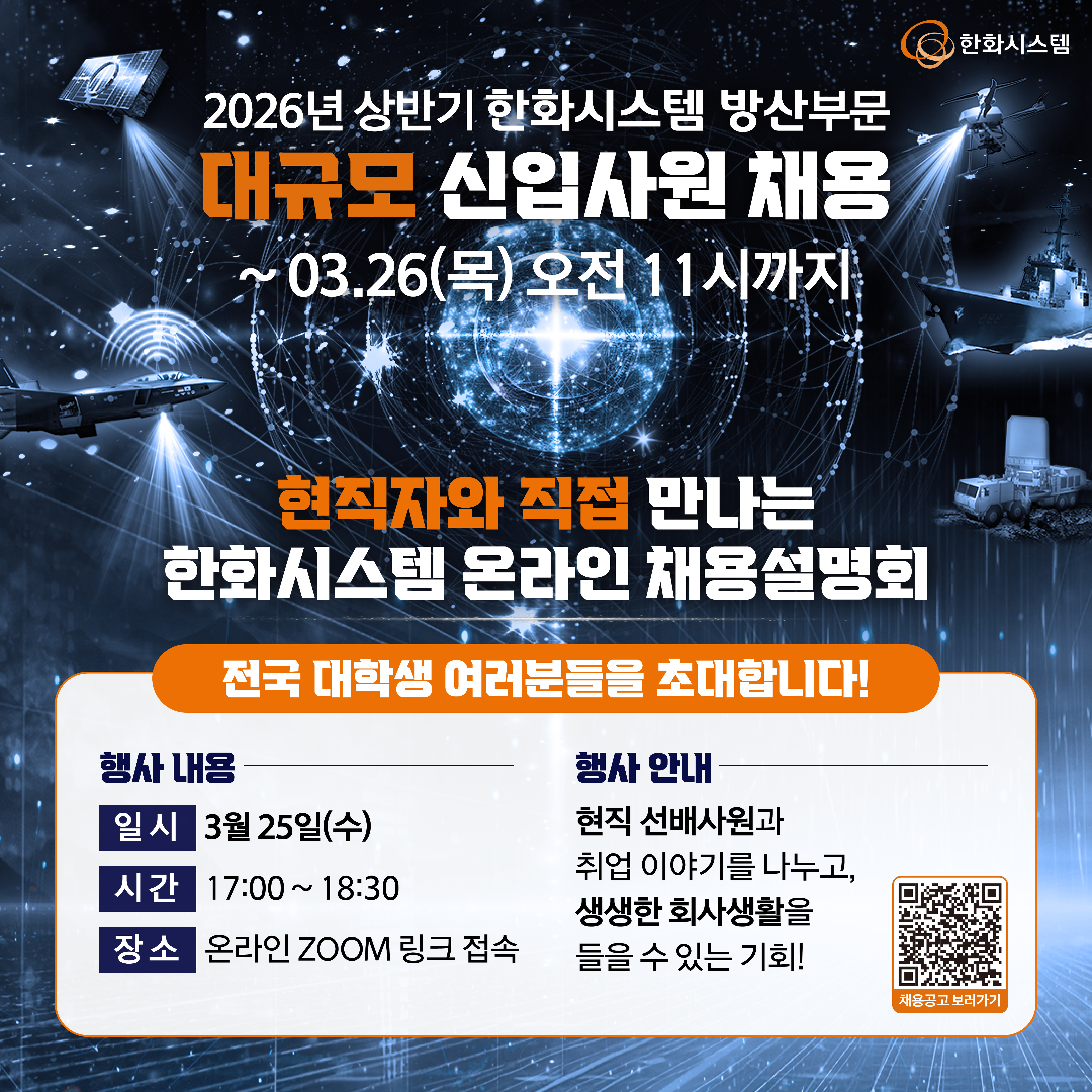 [한화시스템] 2026 상반기 방산부문 신입 채용 (~3/26)