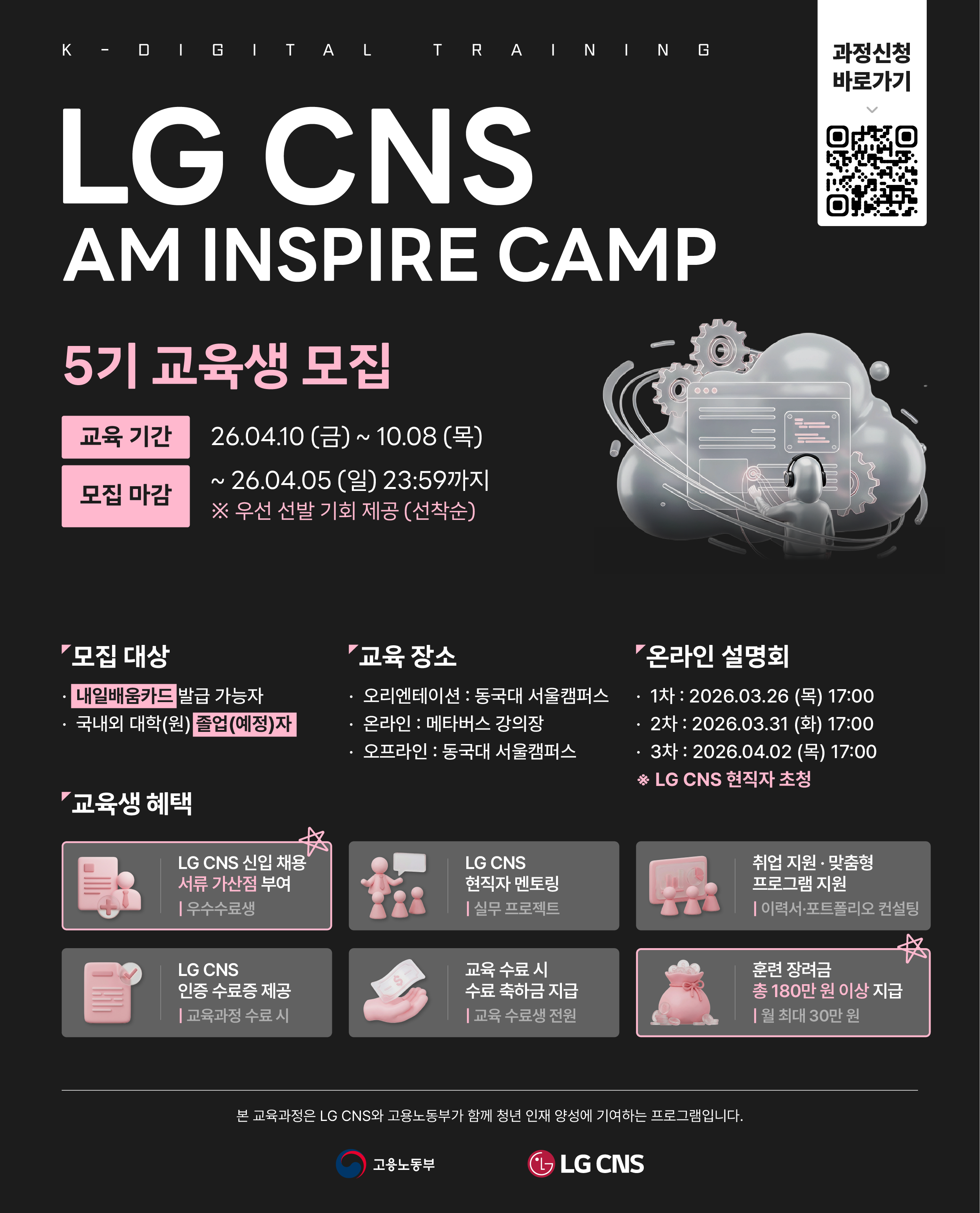 LG CNS와 고용노동부가 함께 청년 인재 양성에 기여하는 실무 기반 IT 교육 프로그램 「LG CNS AM INSPIRE CAMP 5기」 교육생을 모집합니다.