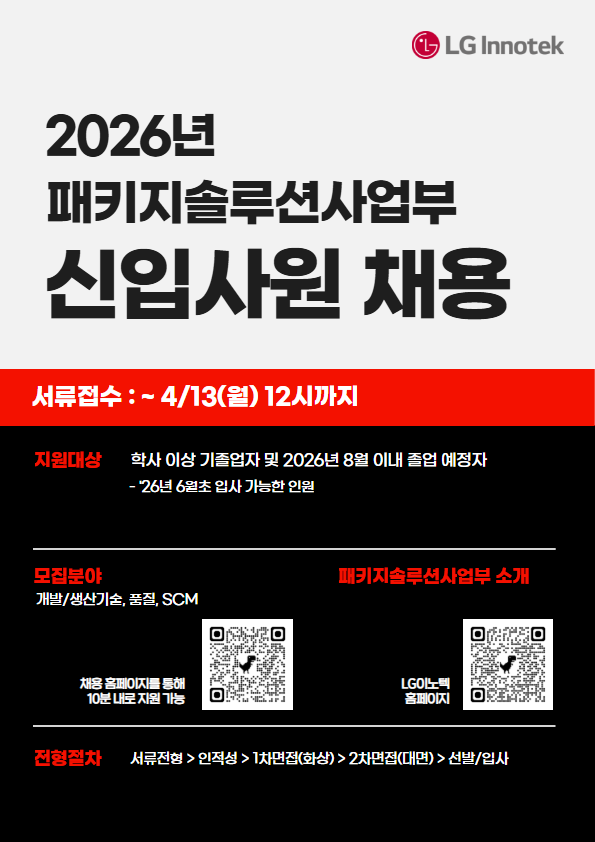 [LG이노텍] 2026년 패키지솔루션 신입사원 채용(~4/13)