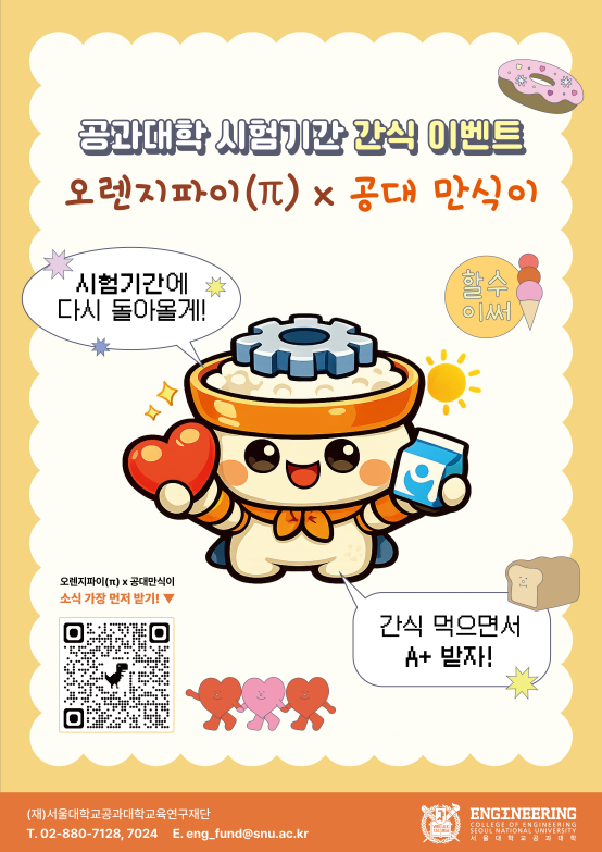 공과대학 시험기간 간식 이벤트 '오렌지파이(π) x 공대만식이' 안내 (4/23, 4/27)