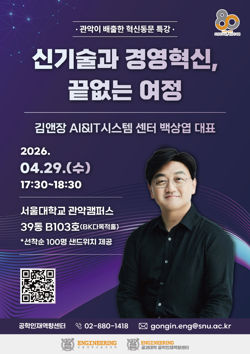 서울공대 구성원으로서의 도전·혁신정신 함양을 지원하고자「관악이 배출한 혁신동문 특강」을 개최하오니,