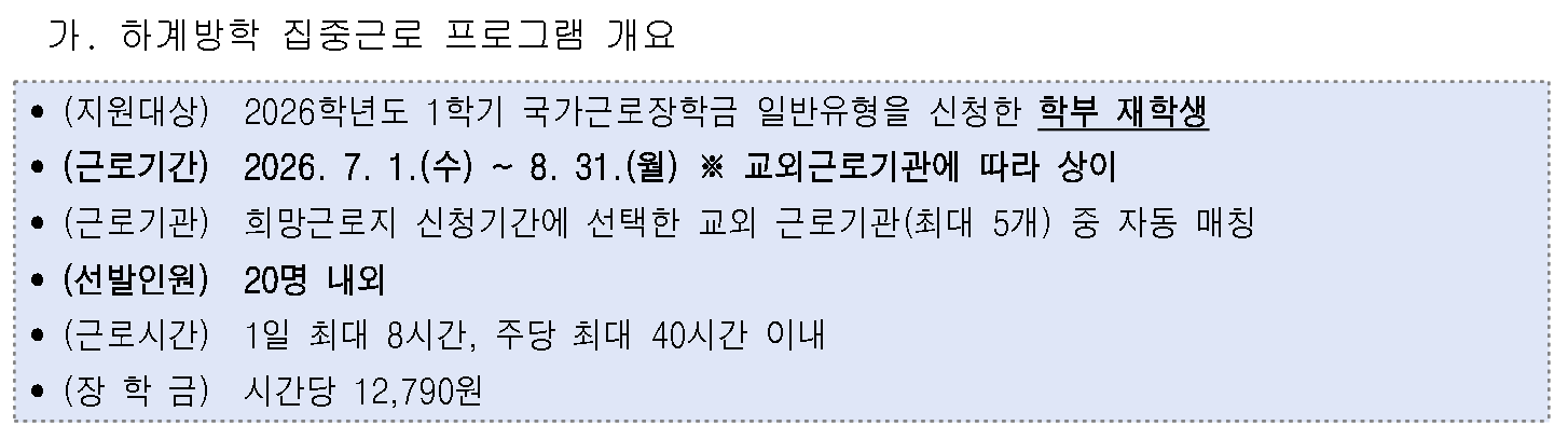 2026학년도 국가근로장학금 하계방학 집중근로 선발 일정 안내