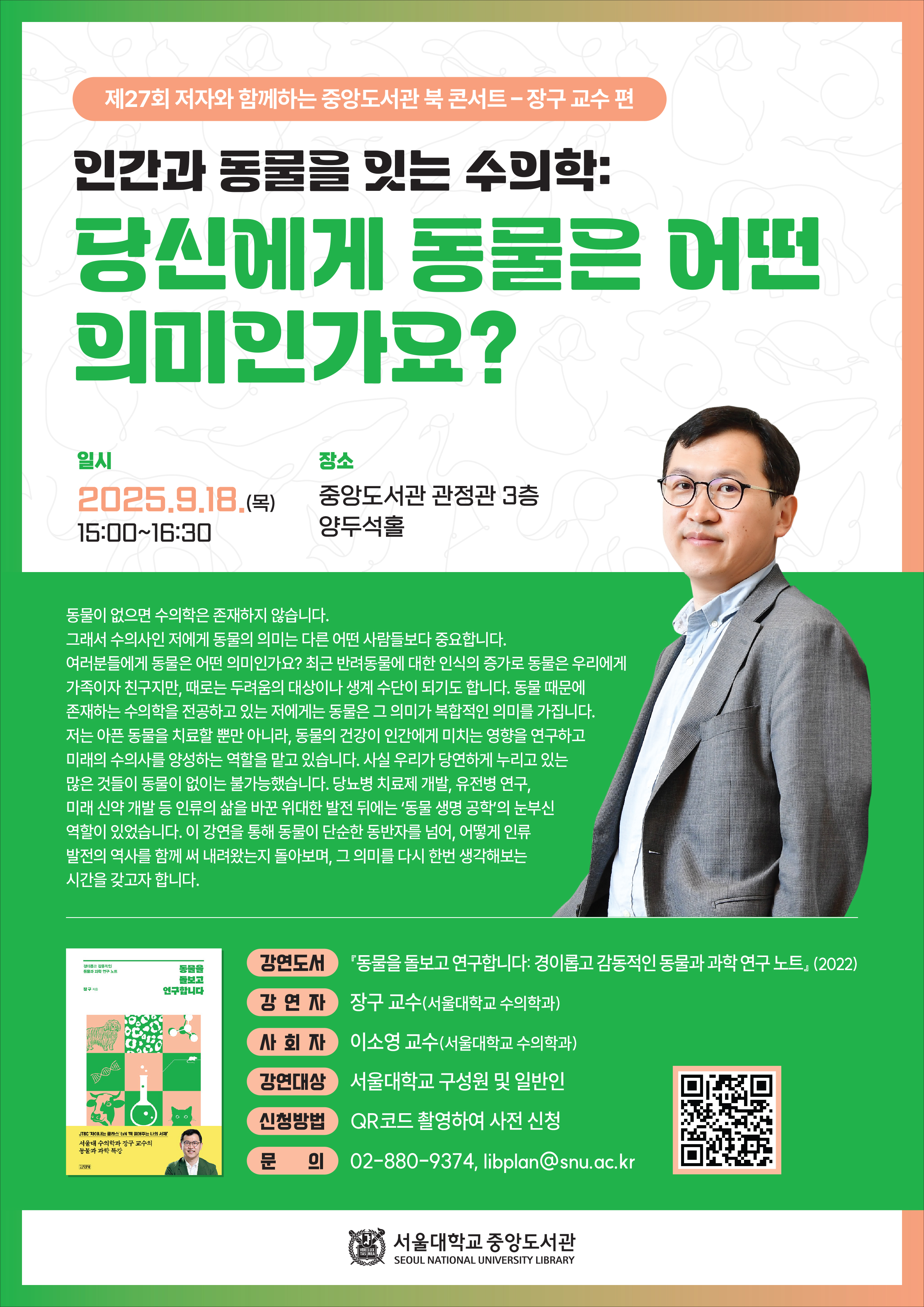 - 강연 명:「인간과 동물을 잇는 수의학: 당신에게 동물은 어떤 의미인가요?」