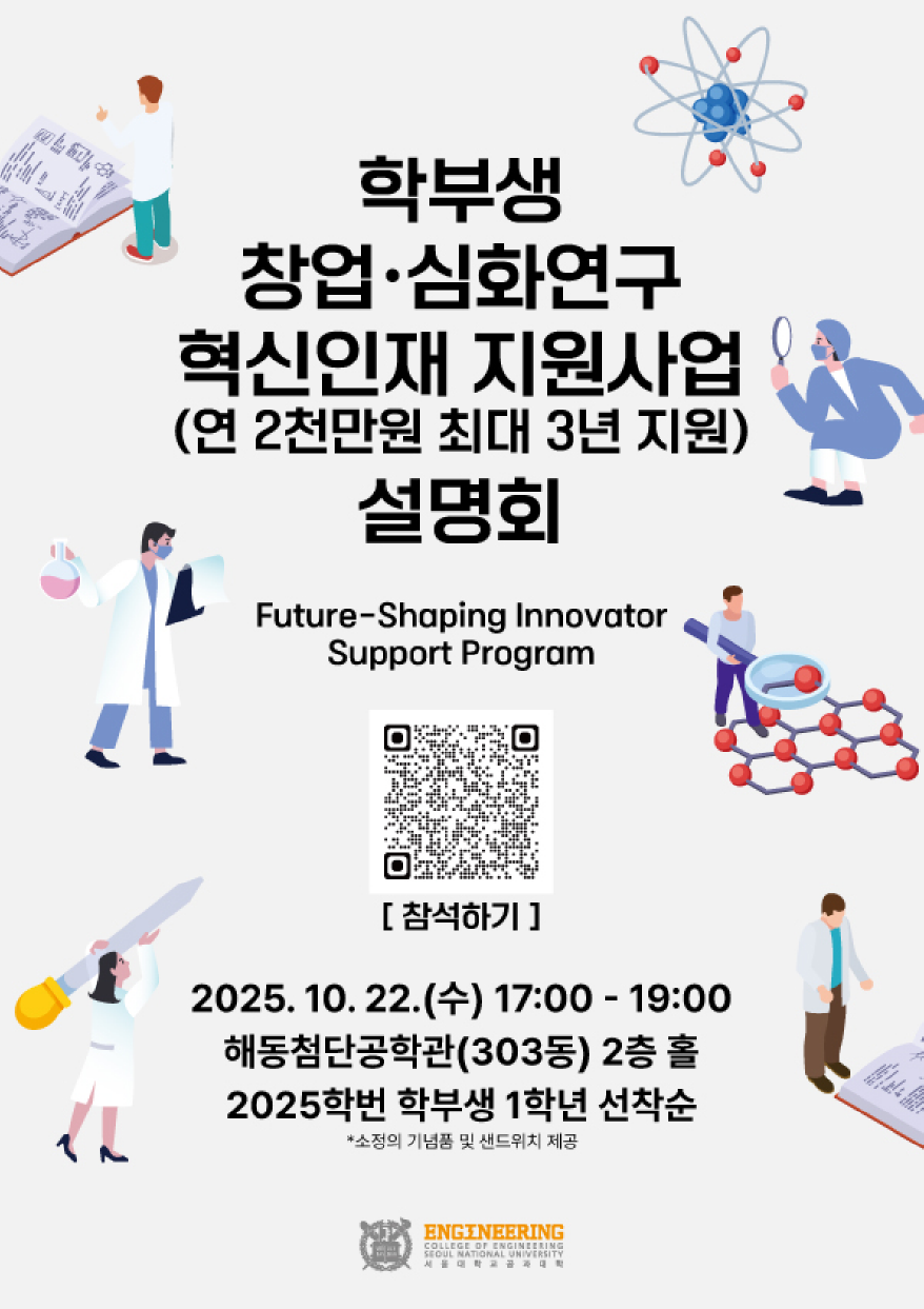 25학번 현 학부생 1학년을 대상으로 창업 및 연구 분야의 혁신인재를 선발하고자 합니다.