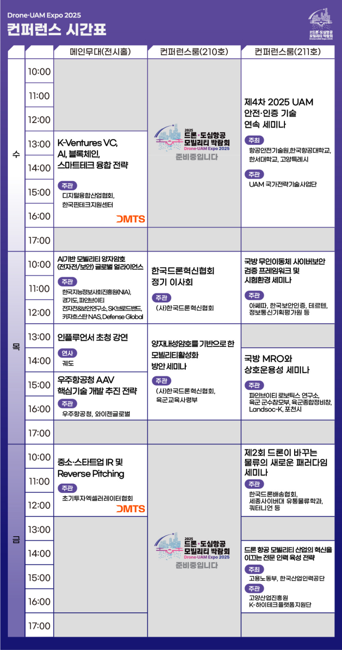마. 주요내용: 드론, UAM 기업, 기관 등 전시, 컨퍼런스(8세션) 및 부대 행사 등
