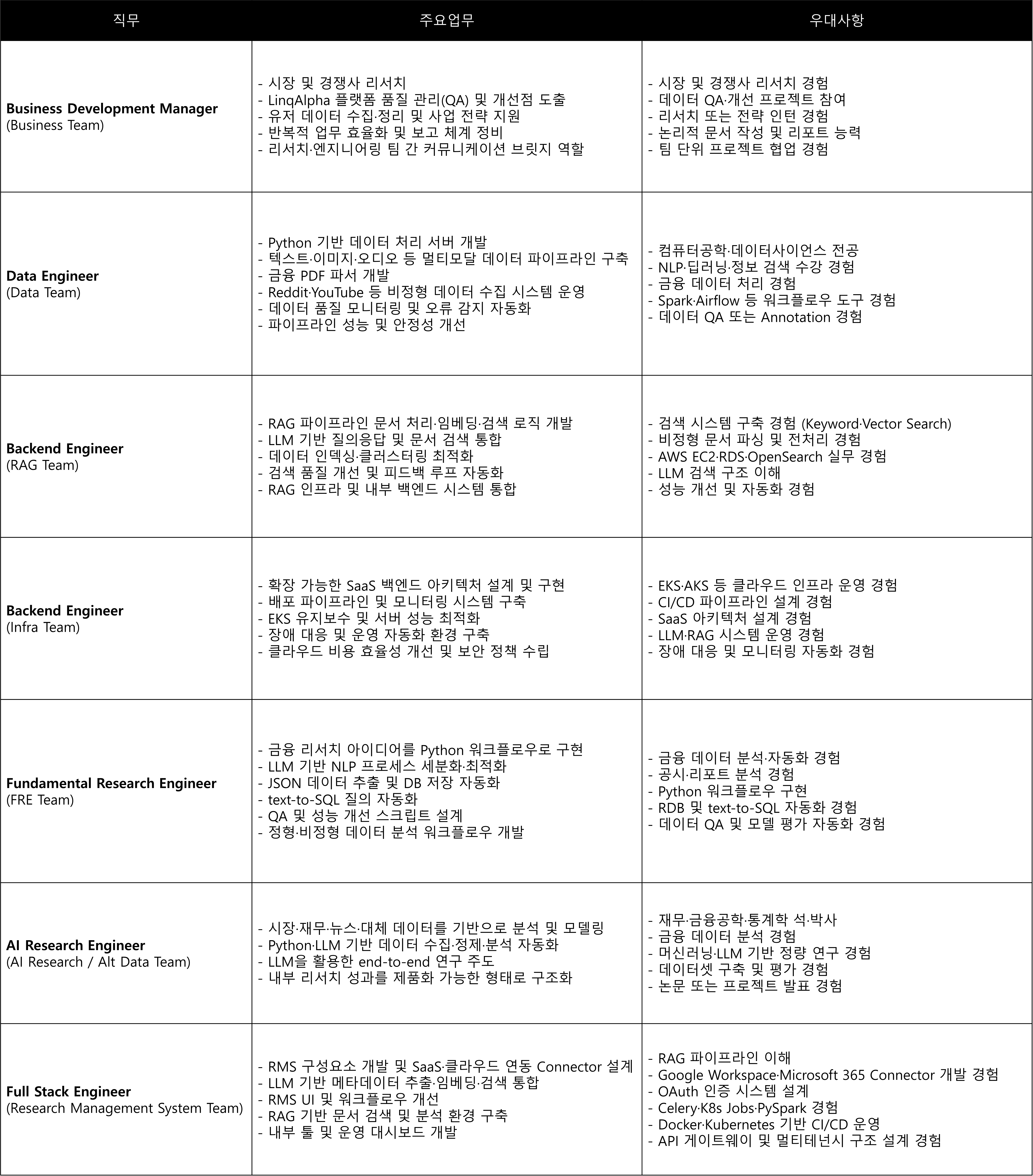 - 우대 사항: 금융 데이터 분석·자동화 경험 / 자연어 처리 기반 공시·리포트 분석 경험 / Python 기반 리서치 워크플로우 구현 / RDB 및 text-to-SQL 자동화 경험 / 데이터 QA 및 모델 평가 자동화 경험