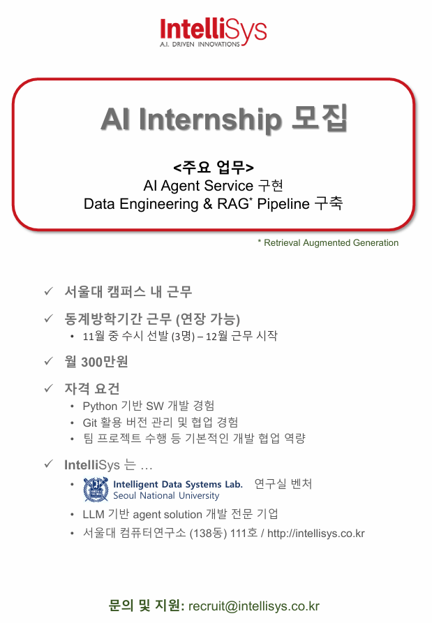 서울대 Intelligent Data Systems (이상구교수님) 연구실벤처인 IntelliSys에서 학부생 인턴을 모집합니다.