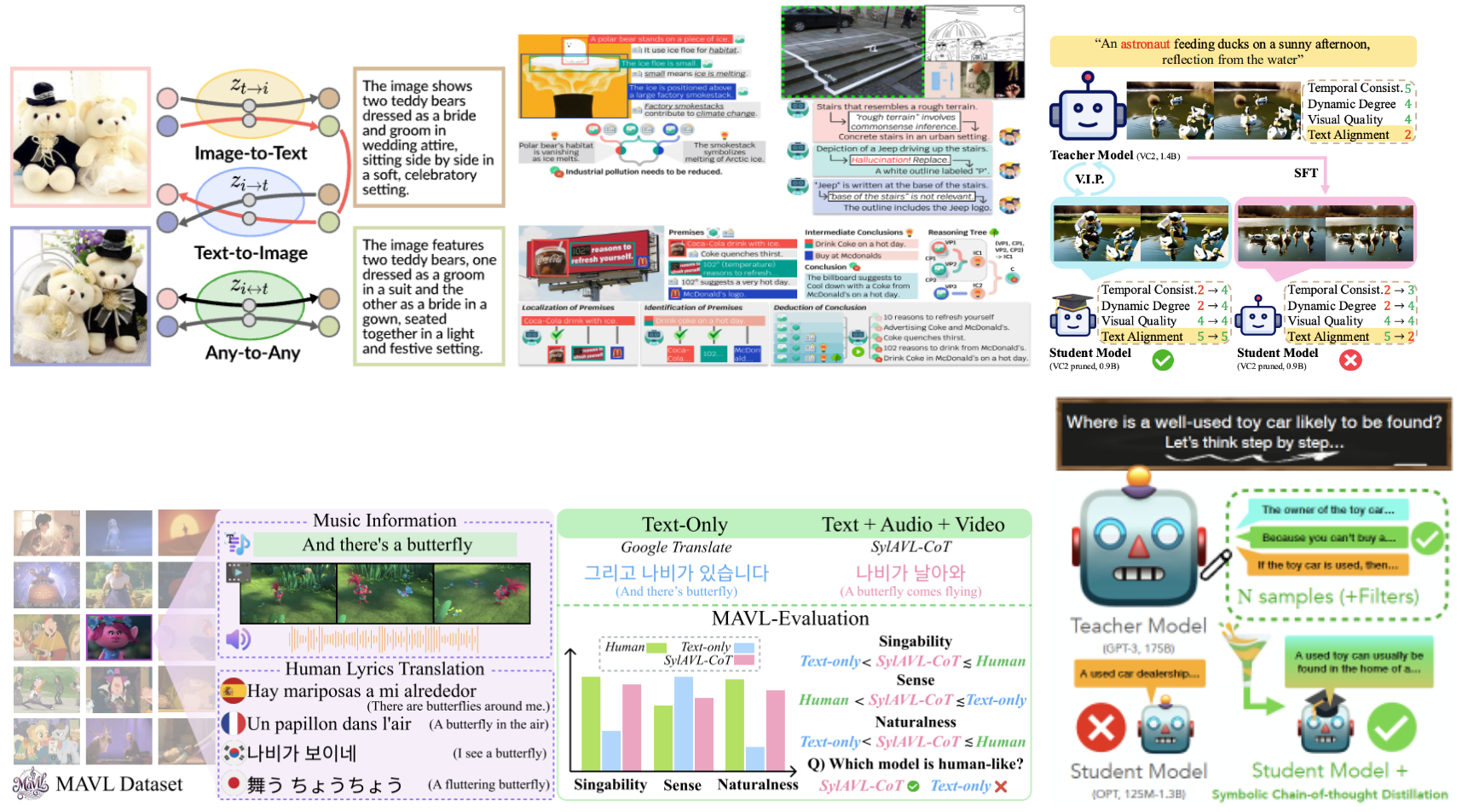 We study the lightweighting and performance improvement of multimodal generative models and multimodal LLMs, and we train a single model to learn heterogeneous modalities—natural language, vision, audio, documents, actions, and UI—while improving reasoning quality in interactive settings.